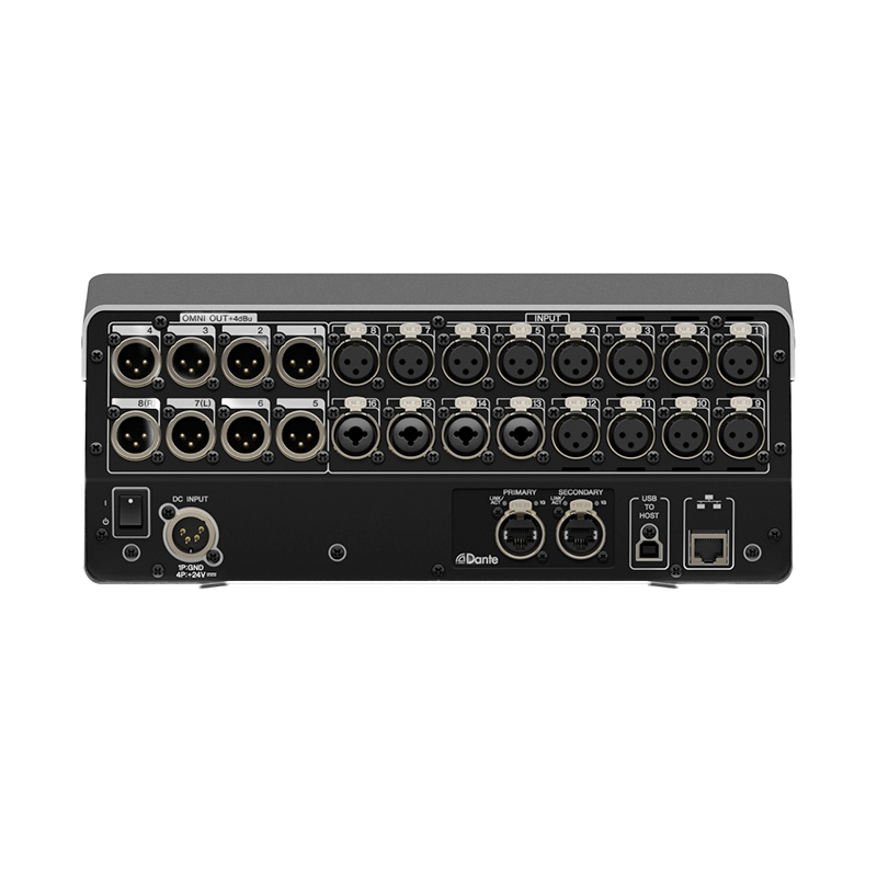 Lokale Eingänge: 16 Mikrofon-/Line-Eingänge (12 XLR + 4 XLR/TRS-Kopfhörer-Combo) und 8 (XLR)-Ausgänge